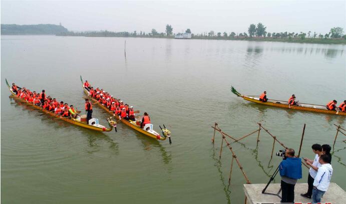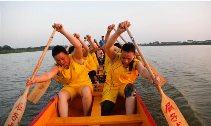 27日下午,屈子文化园香草湖,汨罗女子龙舟队与屈子祠当地农民队、家庭队进行着一场友谊赛较量,岸上呐喊欢呼,水面鼓点激昂,队员们卯足了劲,甩开膀子迎着鼓点,激起一串串的水花。