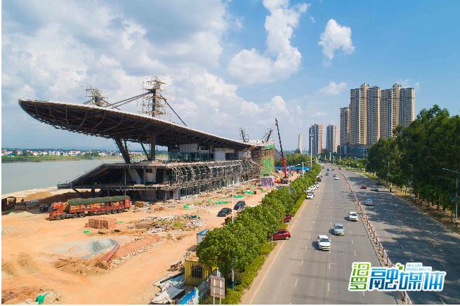 汨罗融媒体讯(记者 周敏) 8月20日,新国际龙舟竞渡中心在蓝天白云江水映衬下,气势雄伟,尽显“城市地标”范。据介绍,竞渡中心主体钢架结构全部完工,室内装饰装修、弱电、消防施工、电器设备安装及室外停车场铺装、绿化同步进场。