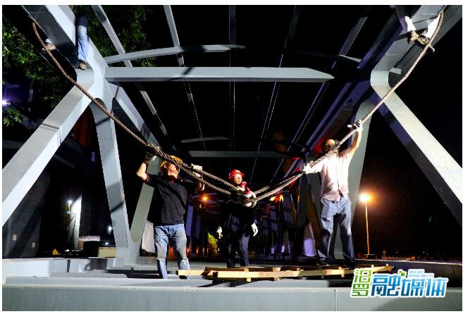 据了解,承建方对主桥分为运输、吊装两个阶段进行施工。今年7月,主桥钢结构半成品被运到汨罗江大道后进行了现场拼装。架设当晚,由于钢结构人行天桥施工难度大、技术复杂、拼装精度高,整个架设过程耗时达5个多小时,但经过项目部的精细施工、严格控制,现场工人最终安全顺利地完成了整个吊装作业。