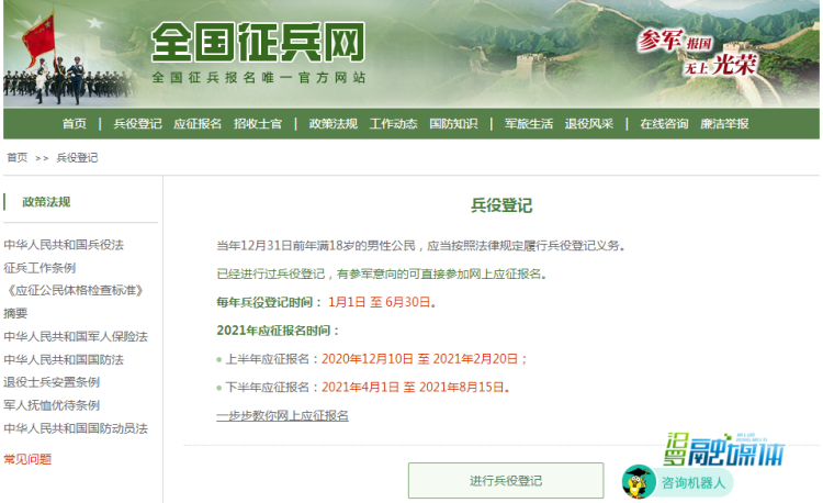 应征青年可登录全国征兵网https://www.gfbzb.gov.cn/bydj/完成兵役登记。