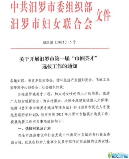 汨罗融媒体讯(记者 张为)近日,记者从市妇联获悉,为推进罗城英才工程,加大对女性优秀人才的培养,根据《岳阳市巾帼英才选拔管理办法》和《汨罗市促进人才优先发展行动计划》,市委组织部、市妇联将在全市开展2021年汨罗市巾帼英才选拔工作,选拔出5名优秀女性,按每人1万元的标准给予资助。