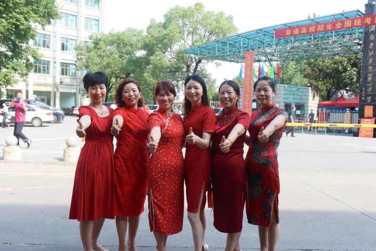 上午9时许,市一中考点外站满了送考的家长。在这其中,身着旗袍的“妈妈团”格外引人注目。“买红色的旗袍寓意鸿运当头、旗开得胜,送向日葵就是一举夺魁。”“祝我们的孩子高考顺利,金榜题名。”“高考大吉,加油。”