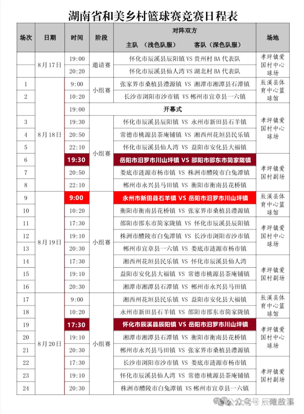 此前,2024年湖南省和美乡村篮球活动(村BA)竞赛日程表出炉,全省共16支队伍参赛,其中,汨罗市川山坪镇篮球队将于8月18日19:00、8月19日9:00、8月20日17:30小组赛分别迎战邵阳市代表队、永州市代表队、辰溪县代表队。