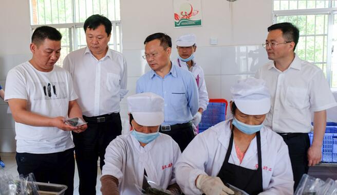 胡忠雄(左三)、谈正红(左二)在屈子祠镇调研屈之源粽子生产情况