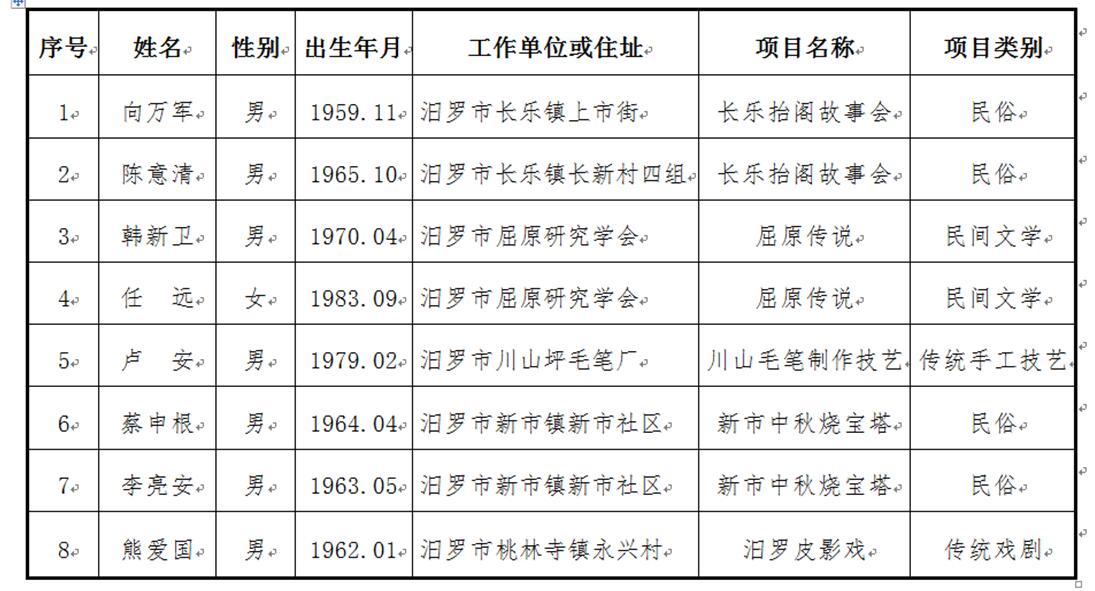 为贯彻落实《中华人民共和国非物质文化遗产法》、国务院办公厅《关于加强我国非物质文化遗产保护工作的意见》(国办发〔2005〕18号)和汨罗市人民政府《关于加强我市非物质文化遗产保护工作的意见》(汨政办发〔2007〕9号)文件精神,有效地保护和传承我市非物质文化遗产,鼓励和支持市级非物质文化遗产项目代表性传承人开展传习活动,建立科学的非物质文化遗产传承机制,根据《汨罗市文化旅游广电新闻出版局关于推荐第二批市级非物质文化遗产项目代表性传承人的通知》要求,在传承人自愿申报、项目保护单位推荐的基础上,市文旅广新局组织市本级非物质文化遗产评审委员会专家进行认真评审,初步确定卢安等8名传承人入选我市第二批市级非物质文化遗产项目代表性传承人。现向社会公示,公示期自2017年11月1日至8日,共7天。公示期间如有异议,请实名向我局公共文化股或市非物质文化遗产保护中心反映。