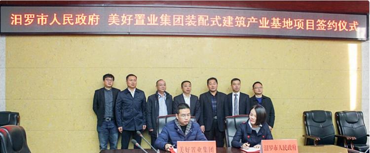 12月8日,汨罗市人民政府与美好置业集团就装配式建筑产业基地项目举行签约仪式。市委副书记、市长朱平波,市委常委、副市长陈若杨,美好置业集团总裁孟凡中,长沙经开集团监事会主席谭超纲,汨罗“飞地”产业园主要负责人等参加。