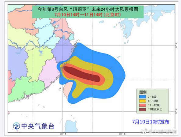 中央气象台10日10时发布今年首个台风红色预警:预计今年第8号台风“玛莉亚”将于11日上午以强台风的强度(14级-15级)在福建福清到浙江苍南一带沿海登陆。受“玛莉亚”影响,今明两天,台湾、福建、浙江东南部、江西等地将迎来强风暴雨。这也将是继台风“艾云尼”之后今年第二个登陆我国的台风。