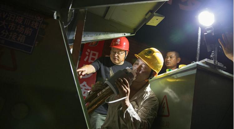 这时,记者的手机上接到了一则电力抢修通知:“尊敬的客户:因中大市场分接箱内电缆烧坏导致汨城三线停电,停电期间给您带来不便敬请谅解!”与此同时,高温下的抢修作业开始了。10分钟过去,分接箱边上的工人们满头大汗,衣服湿透。直至晚上10点多,该处故障终于排除,附近片区恢复供电。