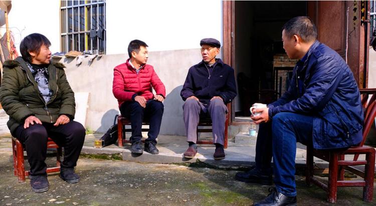 章庆星(左二)、王钢(右一)与贫困户黄卫武交谈