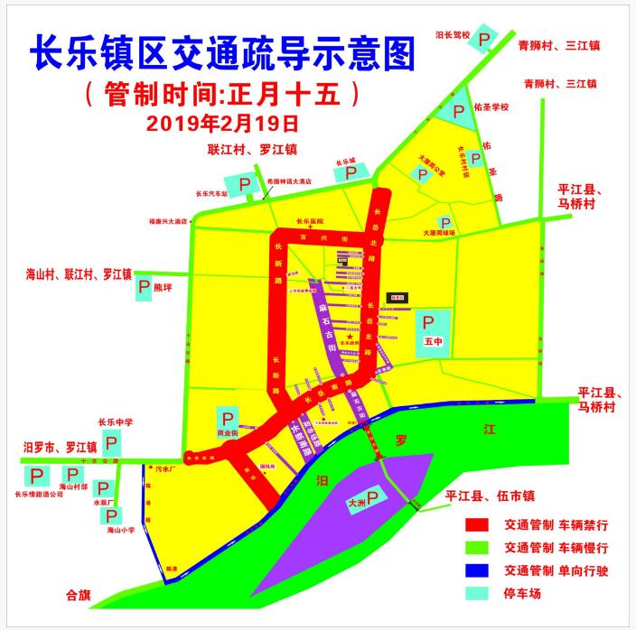 正月十五上午9点至晚上10点活动期间,长乐镇街区实行交通管制,禁止任何机动车辆(含摩托车)和非机动车辆(含自行车)进入管制区域。当日,该镇共设置16处停车场方便游客。同时,对镇区沿江路实行由西往东单向通行,对十古公路长乐中学至汨长驾校路段实行有限交通管制。