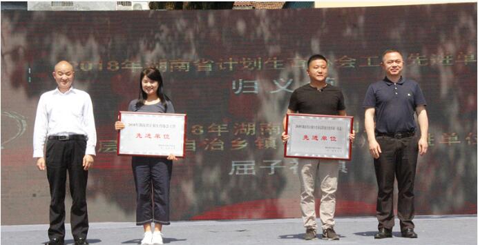 湖南省计生学会业务指导处处长刘琼林(左一)为汨罗市2018年计生工作先进单位颁奖