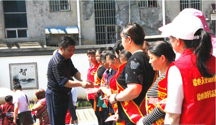 岳阳市计生协会常务副会长赵曙光(左一)为大荆镇贫困妇女送慰问金