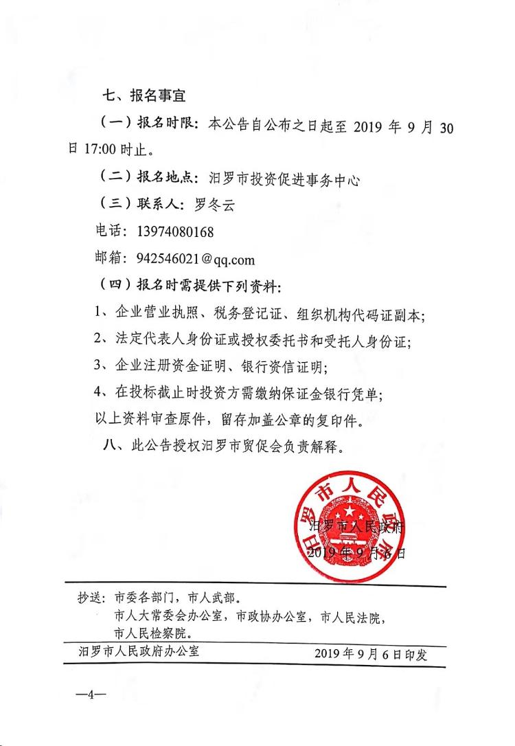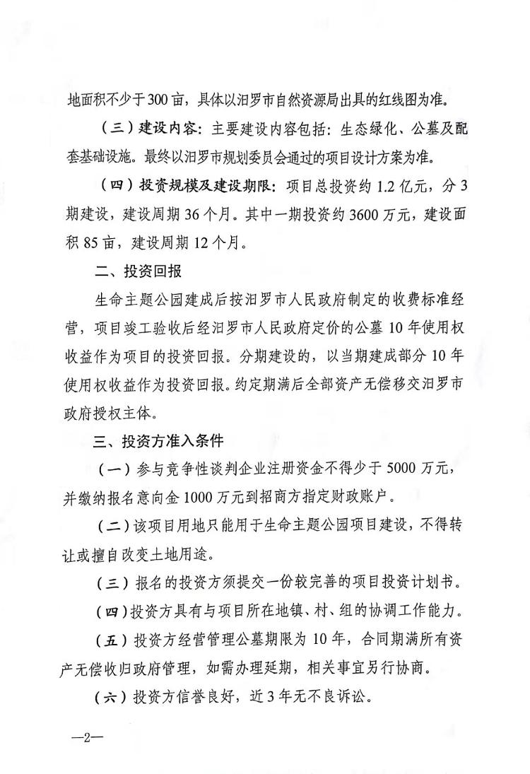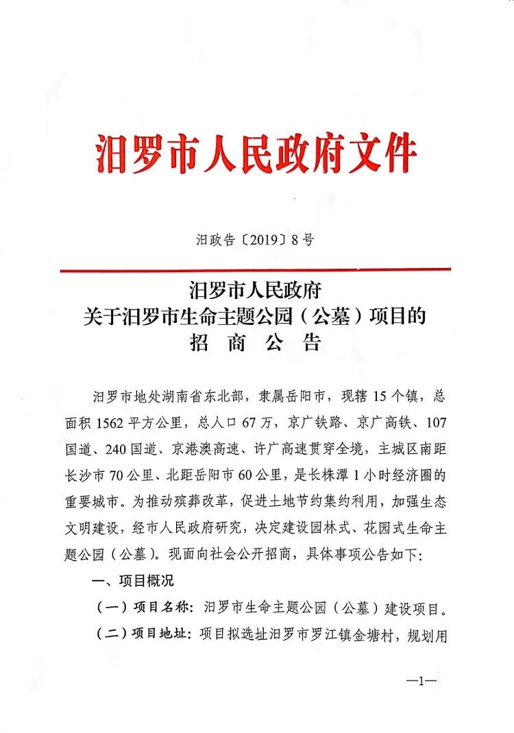 汨罗市人民政府 关于汨罗市生命主题公园(公墓)项目的招商公告