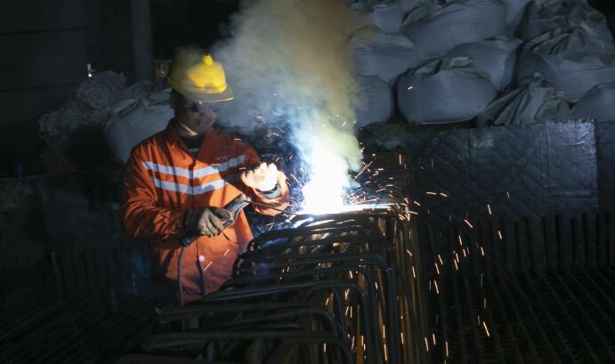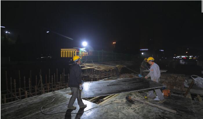 12月16日晚,友谊河荣家路桥施工现场灯火通明,冬夜寒气侵人,但在这股施工热潮面前已没有丝毫威力。这边,工人在焊接钢筋,那边在拼装模版,还有在钢筋焊接……大型吊机如同巨人般矗立在桥头,照明灯下,30多位建设者正在各自岗位上繁忙作业。