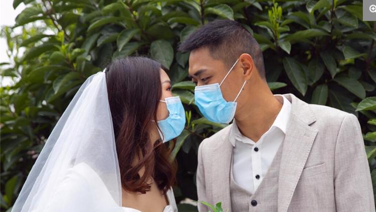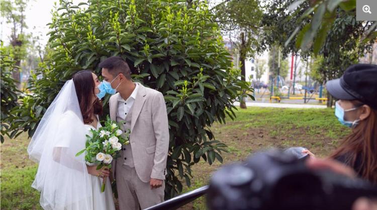 2月27日,汨罗屈子生态湿地公园,29岁的小伙余亚波和未婚妻黄洁,戴上口罩,拍下了一套特殊婚纱照。