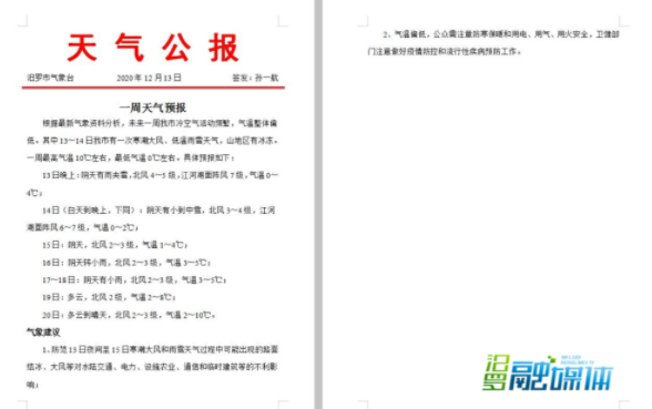 据汨罗气象台天气公报,未来一周汨罗冷空气活动频繁,气温整体偏低。其中13~14日有一次寒潮大风、低温雨雪天气,高山地区有冰冻。一周最高气温10℃左右,最低气温0℃左右。具体预报如下:14日(白天到晚上,下同)阴天有小到中雪;15日阴天;16日阴天转小雨;17~18日阴天有小雨;19日多云;20日多云到晴天。