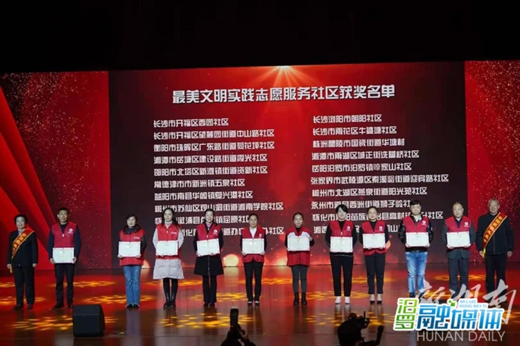 仪式上,一批湖南文明实践志愿服务先进典型受到表彰,其中,汨罗市汨罗镇瞭家山社区荣获“湖南省最美文明实践志愿服务社区”。仪式现场,该社区的文明实践志愿服务故事被搬上了大银幕向全省推介,社区党总支书记何永胜上台接受颁奖。