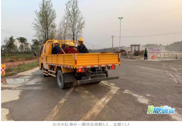 同天,在白水镇越江村路段,民警在执勤过程中发现一辆轻型多用途货车有交通违法及驾驶室超员、货厢违法载人的嫌疑,即指挥该车靠边停车接受检查。经现场检查,该车驾驶室核载5人,实载6人,且货厢载员7人,共13人。