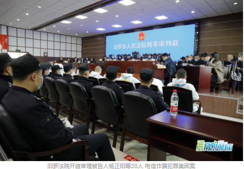 汨罗融媒体讯(记者 张为)4月13-14日,湖南省汨罗市人民法院公开开庭审理被告人杨正阳等20人电信诈骗犯罪集团案,该案涉及诈骗罪、侵犯公民个人信息罪、掩饰、隐瞒犯罪所得罪等多项罪名,涉案金额共计一千万余元。