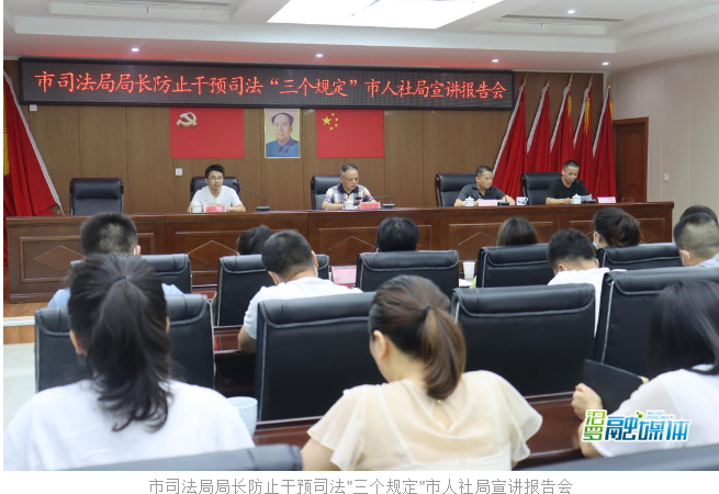 党课后,市司法局局长防止干预司法"三个规定"市人社局宣讲报告会举行。市司法局相关负责人向人社局全体党员详细阐述"三个规定"出台的背景及意义,解读"三个规定"的主要内容,明确"三个规定"的具体要求。彭庆雄代表全体党员公开承诺将认真学习、积极宣传、严格遵守"三个规定"。(张为)