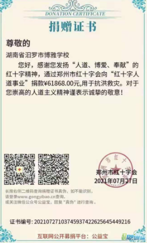 为了向河南灾区贡献自己的一份力,近日,汨罗市博雅学校发出爱心捐款倡议,学校领导、党员同志带头,师生和家长广泛参与,采取线上募捐的方式,筹集捐款达61868元。7月27日上午10点,汨罗市博雅学校已通过郑州市红十字会向"红十字人道事业"捐款61868元,用于抗洪救灾。( 姚望 孙俊)