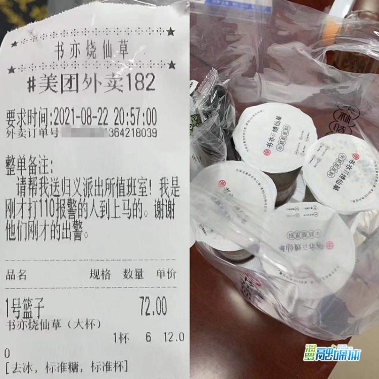 罗融媒体讯(记者 李亚)8月22日晚21时许,6杯温热的奶茶被外卖小哥送到了归义派出所接处警大厅,订单的备注上写道:“请帮我送到归义派出所值班室,我是刚才打110报警的人,谢谢他们的出警。”看到备注,值班民警明白了奶茶的来历,也被这突如其来的奶茶感动到了,这不仅是来自群众的关心和问候,更多的是对该所工作的支持和认可。