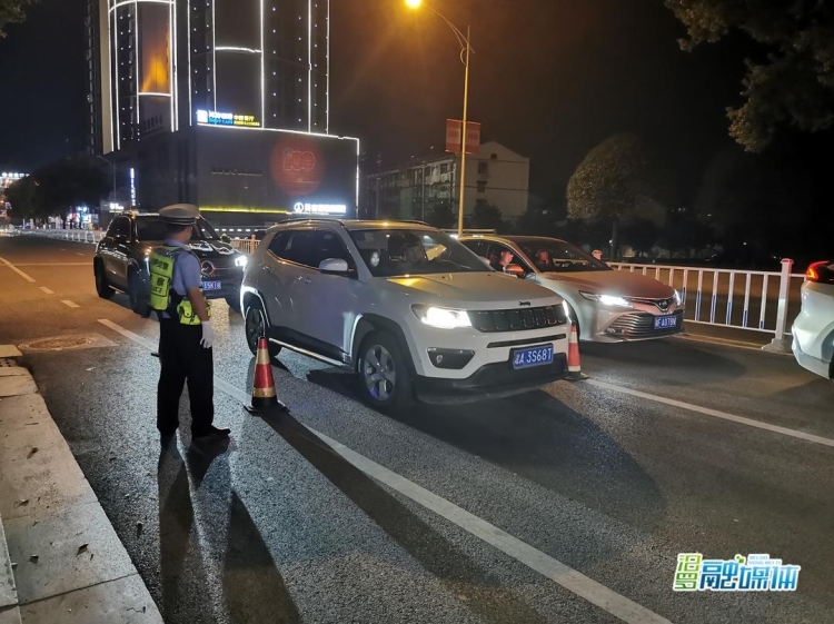 交警大队长乐中队民警在建设中路高寿桥设卡检查过往车辆