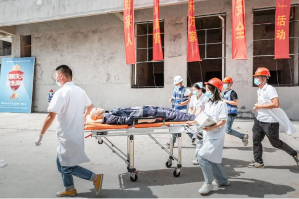 “安全生产月”启动仪式后,开展了施工安全现场高空坠落和消防应急演练活动。本次演练模拟工人中暑后不慎从架体上不慎“跌落”,同时因工人随意丢弃的烟头引燃了苯板,引发火情形成火灾的场景。项目迅速启动应急响应,有序组织人员疏散,开展火灾的扑救与受伤人员的应急救援。因救援组织得力,大火快速被扑灭,受伤人员被迅速救治送医,应急演练取得圆满成功。