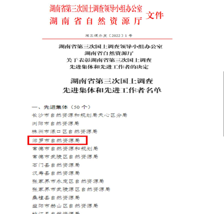汨罗融媒体讯(通讯员 李鹏) 近日,湖南省第三次国土调查领导小组办公室、湖南省自然资源厅联合印发《关于表彰湖南省第三次国土调查先进集体和先进工作者的决定》,汨罗市自然资源局被授予"湖南省第三次国土调查先进集体"称号。