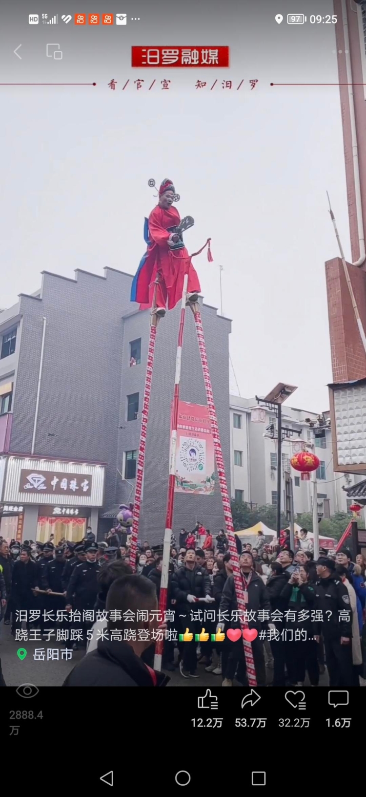 "他来了,他来了!"2月4日,一则《试问长乐故事会有多强?高跷王子脚踩5米高跷登场》的短视频火爆全网!"高跷王子"郑大军身着鲜红的七品芝麻官戏服,手摇折扇,踩着5米的高跷,做出扭、跳、弯腰、后仰等诙谐幽默的动作,引来观众喝彩欢呼不断。这条由汨罗市融媒体中心拍摄的视频,三天内在视频号、抖音号上播放量达4783万。