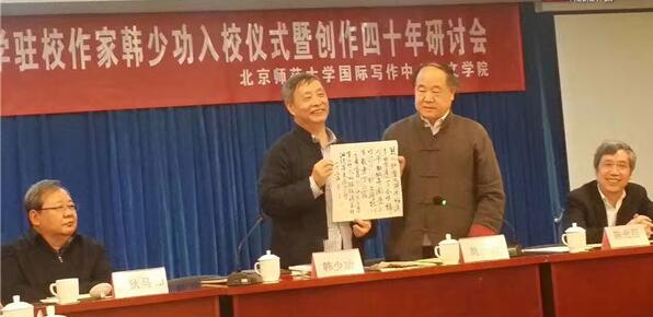 4月1日,北京师范大学隆重举办“求索之路永无止歇:北京师范大学驻校作家韩少功入校仪式暨创作四十年研讨会”,著名作家韩少功先生成为该校第9位驻校作家。仪式由中国首位诺贝尔文学奖得主、北师大国际写作中心主席、文学大师莫言主持,来自全国各地近30名著名作家、文学评论家出席。