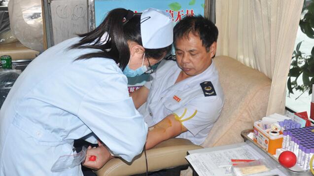 登记、体检、消毒、采血等步骤有条不紊地进行着。一位头发微白,精神抖擞的老干部坐上了采血位。