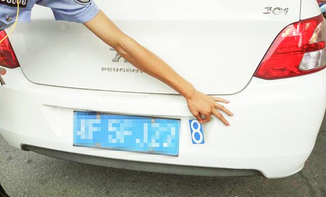 原来民警发现该车悬挂的车牌有异样,所挂车牌号“湘F***28”尾数“8”有明显粘贴痕迹。经对照司机的行驶证,这辆白色标致车的真实牌照为“湘F***22”。面对民警的询问,司机冯某当场承认了自己篡改车牌号的行为。