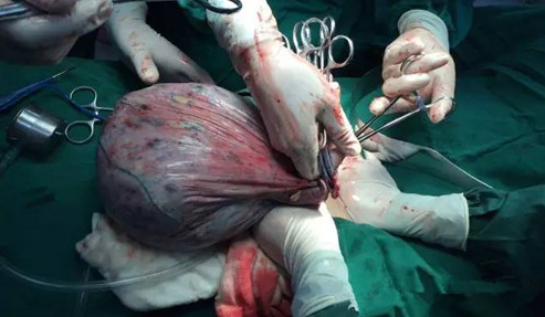 “患者来的时候右侧腹腔隆起,看着更像怀孕三四个月的孕妇。目前,世界范围内切除的畸胎瘤直径最大的约40厘米,像韩奶奶身患如此巨大的肿瘤还是很罕见的。”胥景介绍,随后该院组织外科及相关科室会诊并制定手术方案。