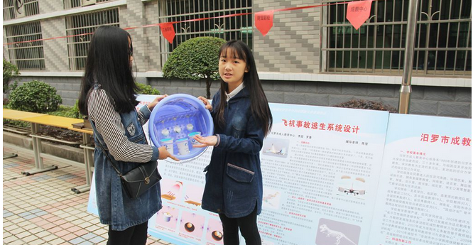 “‘飞机起火,请乘客做好弹射准备!’广播内传来机长沉着的命令,机组人员按下逃生按钮, 机舱底部打开,乘客座椅先后弹射而出,在降落伞的帮助下安全着陆,一场空难有惊无险……”11月10日,在汨罗市第十届青少年科技创新节暨“盛腾杯”创新 大赛现场,2名学生正在向观众介绍自己创作的《飞机事故逃生系统设计》。当天,该模型和另外63件作品均荣获一等奖,它们将被送往上级参评或申请专利。