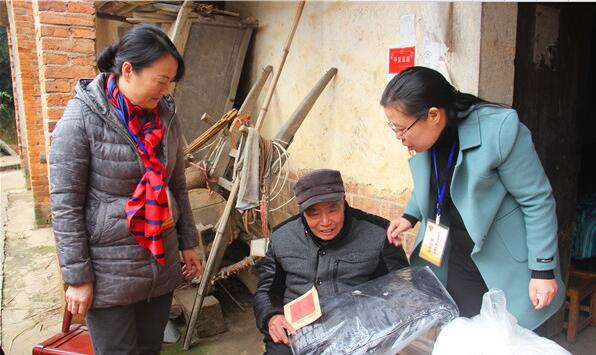 “易大哥,您家过年的腊肉都准备好了吗?”“准备好了,准备好了。”志愿者一行来到来到贫困户易新伍和吴秋阳家。易新伍因患支气管炎,丧失劳动力,妻子身体也不好,一家人的开支只能靠低保。吴秋阳今年70多岁,多年来一直一个人生活,无人照顾。志愿者给他们送上棉被衣服和油米,叮嘱他们注意身体,并提前祝他们新春快乐。