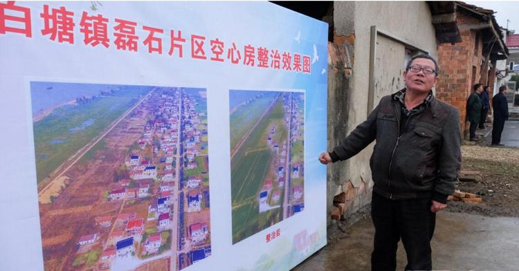 村里一条笔直的大道沿大堤铺开,两侧是村民们的房子。行走村中,新房、老房交错而存。新房多为漂亮的乡村小别墅,老房则基本废弃,庭前杂草丛生。“村里有100多栋空心房,这次全面整治空心房,群众的大力支持。我们期盼,这些空地清理出来,可以多种些菜!”指着空心房整治效果图上多出大片绿色田野,六湖村村支书彭云飞兴奋不已。