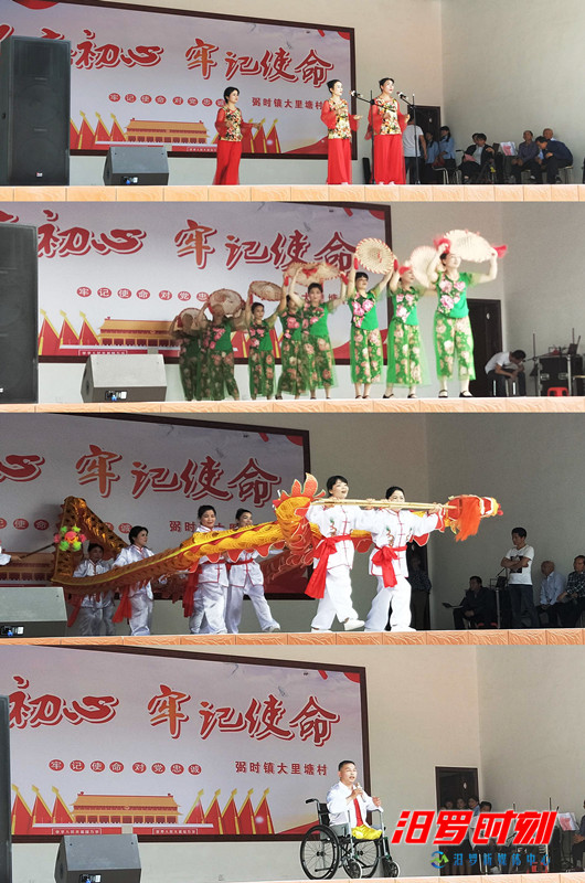 《赞弼时》《治陋习、树新风》《从严治党警句》《双脚踏上幸福路》……舞龙、京剧、快板、表演唱轮番上演。当天,由村文艺表演队、老年协会、文艺爱好者组成的表演队伍共演出了21个节目,歌唱了美好新时代,赞颂了新农村的美好新生活,充分展示了大里塘村村民积极向上的精神风貌。四方八邻的村民也欢聚在村级服务中心广场的乡村大舞台,享受了一次文艺大餐。