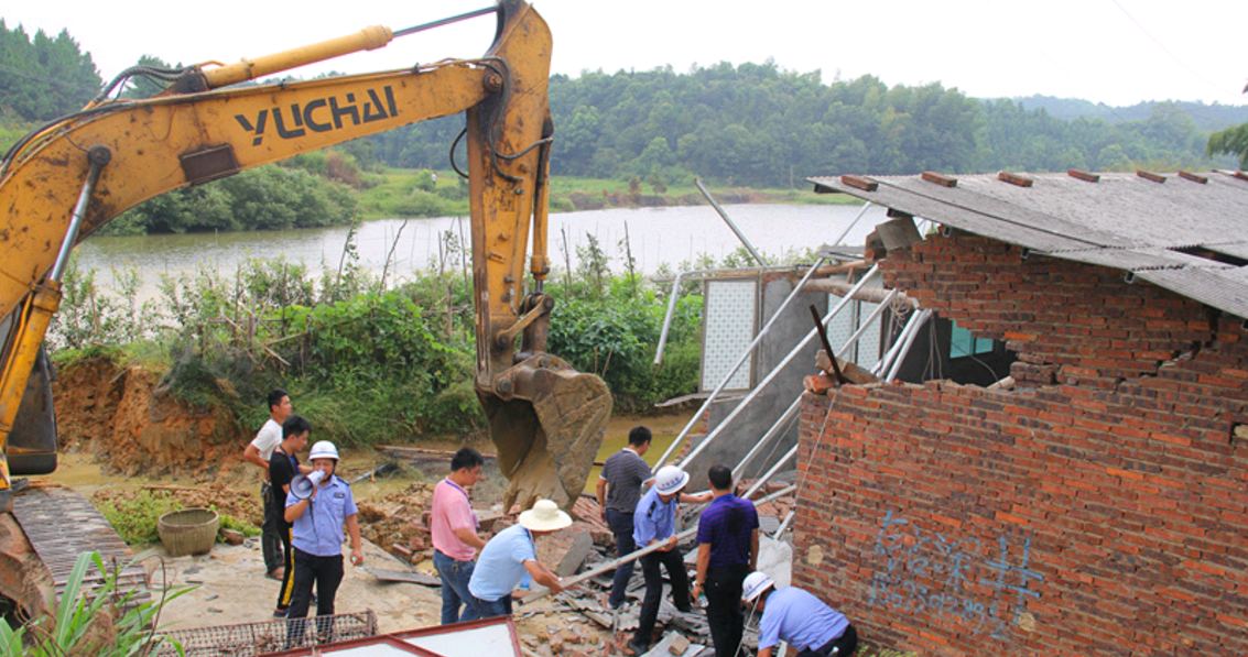 今年5月,市水务局接到群众举报称,隘口水库范围内有2处村民建房,污染水源,严重影响下游灌溉,执法人员核查后下达《责令停止水事违法行为通知书》,但当事人拒不执行。8月17日,市水务局联合控建拆违办组成100余人的执法队,依法将其强拆,并将围垦区域还原。