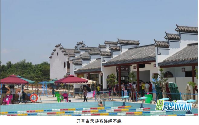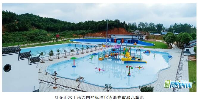 站在一个宏大四合院的青瓦白墙之下,抬眼是一方青山,翠绿丛中,露出红花山顶庙宇的尖尖一角;低头是一汪蔚蓝清水,映照蓝天白云。整齐赛道泳池、色彩斑斓乐园,孩子们扑腾扑腾跳进水中,溅起大片晶莹水花,如夏日里一口沁凉冰饮。