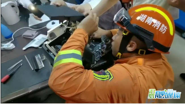仔细确认点钞机卡手的关键位置后,消防员慢慢将滚筒螺丝拧松,小心翼翼用螺丝刀将手与滚筒之间顶开一条缝隙,顺利将女职员被卡的左手拉出。此时,她的手背已出现大片红肿。