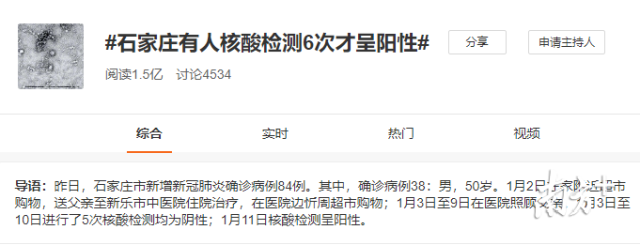 1月13日,话题 #石家庄有人核酸检测6次才呈阳性# 冲上微博热搜,引起网友热议: