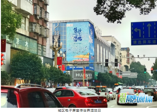从市区到乡镇,从湿地到居民家……工作人员将各类保护湿地的横幅、画册挂在目之所及处,鼓励公众共同行动,为保护湿地做出积极努力。当天共张贴画册两千份,挂横幅二十条,电子屏宣传十二处。