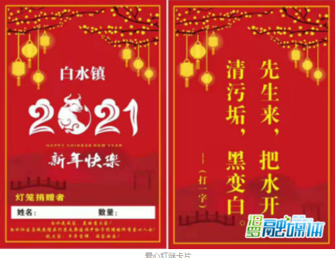 一周来,为打破疫情带来的压抑氛围,让白水集镇的居民们在家也能过大年。白水社区组织了盛大的灯笼捐赠活动,用来建设灯笼走廊,每一盏灯笼都悬挂着专属于捐赠者的灯谜卡片。截至目前,总共收到灯笼走廊建设捐赠款17808元,折合成灯笼445盏。