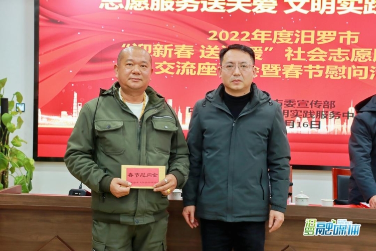 今年1月,民间河长钟爱华(左)受到汨罗市委文明实践服务中心表彰