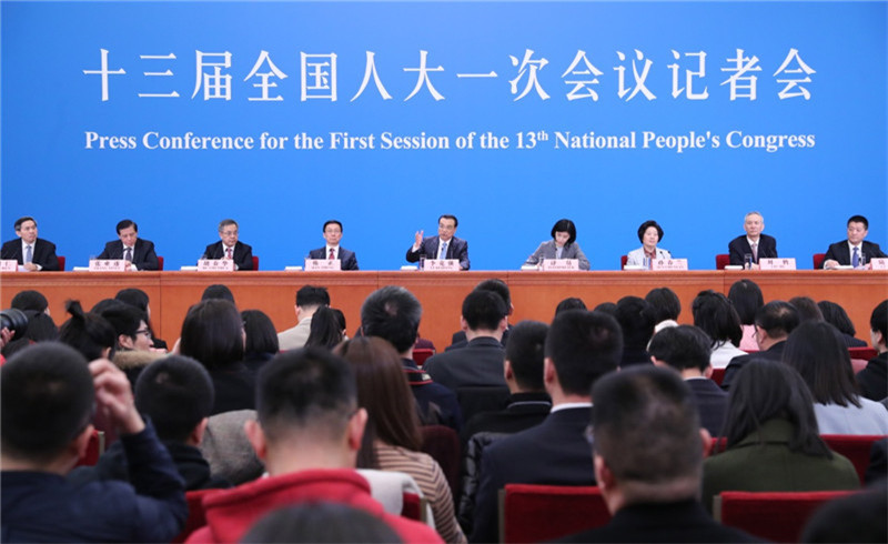 3月20日,十三届全国人大一次会议在北京人民大会堂举行记者会,国务院总理李克强应大会发言人张业遂的邀请会见中外记者,并回答记者提问。国务院副总理韩正、孙春兰、胡春华、刘鹤参加。新华社记者 丁林 摄