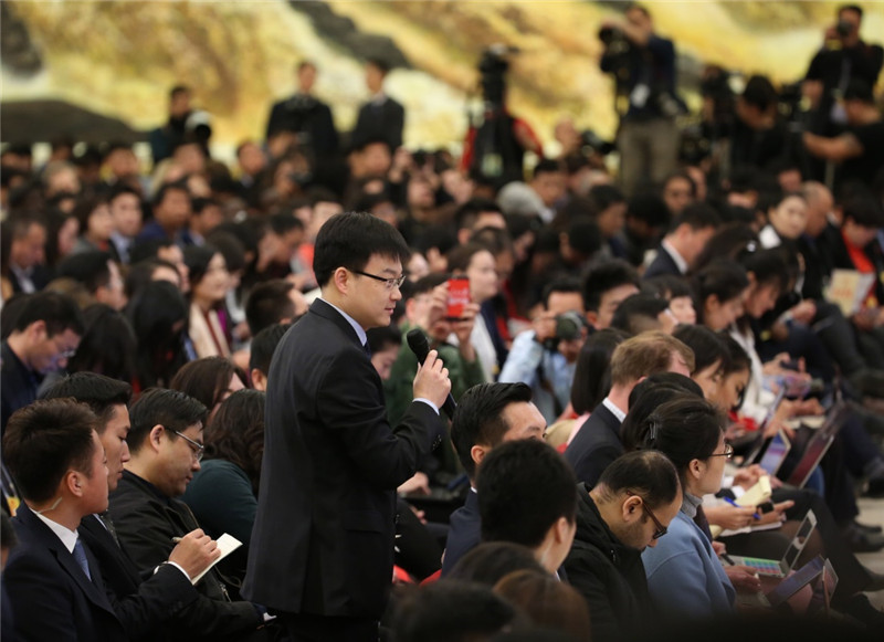 3月20日,十三届全国人大一次会议在北京人民大会堂举行记者会,国务院总理李克强应大会发言人张业遂的邀请会见中外记者,并回答记者提问。国务院副总理韩正、孙春兰、胡春华、刘鹤参加。这是记者在提问。新华社记者 金立旺 摄