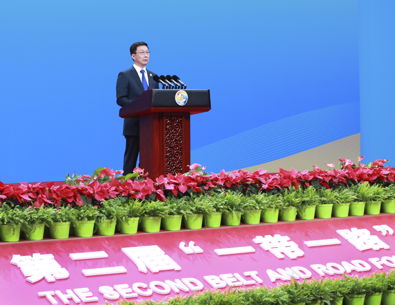 韩正在致辞中说,习近平主席在第二届“一带一路”国际合作高峰论坛开幕式上发表了精彩的主旨演讲,全面回顾了共建“一带一路”的进展和成果,系统阐述了中方对高质量共建“一带一路”的设想和建议,勾勒了下一阶段国际合作蓝图,让各方对共建“一带一路”的美好未来有了更多憧憬和期待。