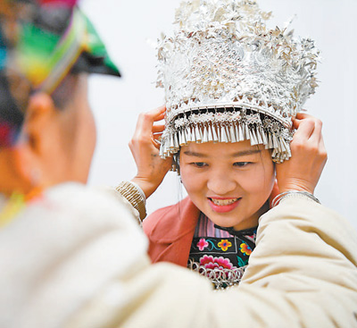 杨云妃在妹妹杨云秋的帮助下戴好头饰,准备前往相亲会现场。新华社记者 薛宇舸摄