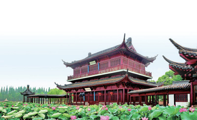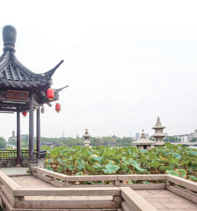 在芙蓉楼两侧,两座仿古建筑互成犄角,彼此之间由曲折回廊相连(图④,影像中国):东北为紧贴水面的“冰心榭”,是展示茶艺的场所;东南为“掬月亭”,可近眺湖中的三座汉白玉石塔。